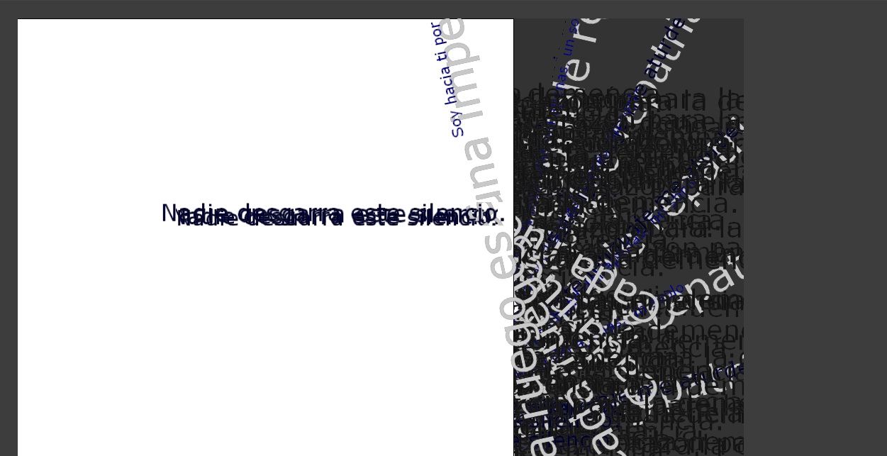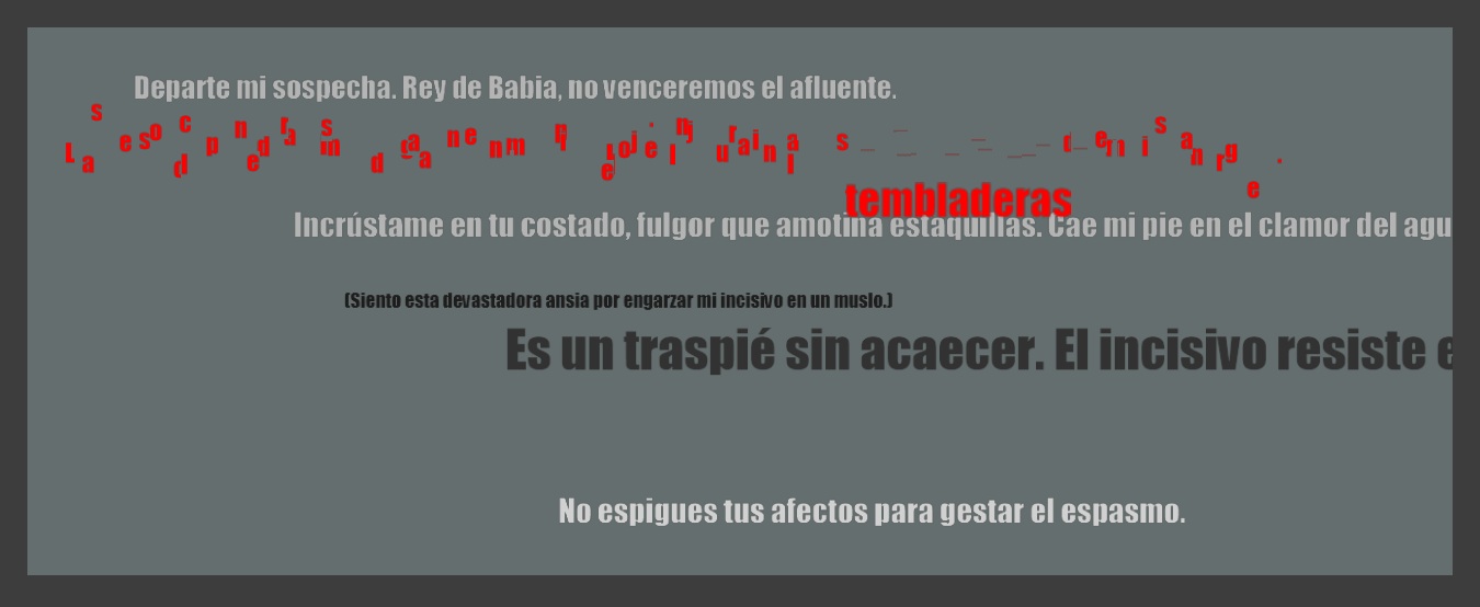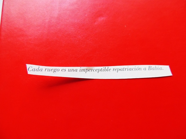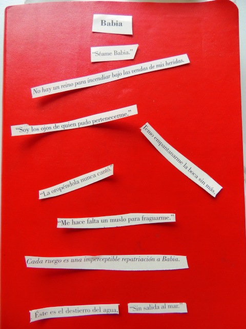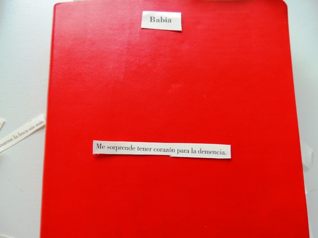 En un principio, escogí los versos que me más cercanas a mi concepción de Babia, que era una narración oral y una historia no oficial sobre mi familia, como: "Me sorprende tener corazón para la demencia" o "La saliva de esos viejos que hablan hasta la rabia". Estos versos fueron la genésis del libro, con el que esperaba acortar la distancia entre mi padre y yo. Cada poema visual se basa en alguno de estos versos, empezando por el título . Estos versos son los que más me causan sentimientos encontrados en la relectura de Babia y están presentes en los primeros borradores. Fue así que supe que mi libreta roja que fungió como diario de viaje, es un poema-objeto en sí. Posteriormente, procedí a deshumanizar algunos versos con el objetivo de hacer una nueva representación que sea insustancial y se aparte de la cuestión dinámica de mi libro: la destructiva relación con mi padre. El intimismo, entonces, se ve minado con estos poemas visuales, que son despersonalizados y realizados genéricamente para alejarse de temas constantes en el libro como el fascismo español, la familia disfuncional y el exilio.