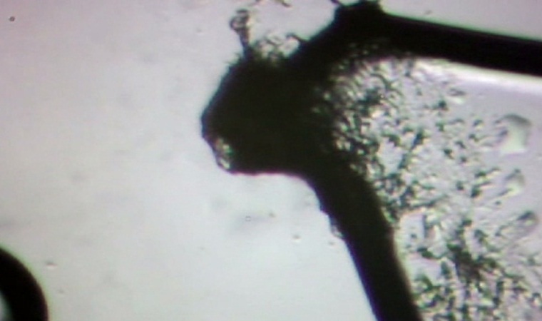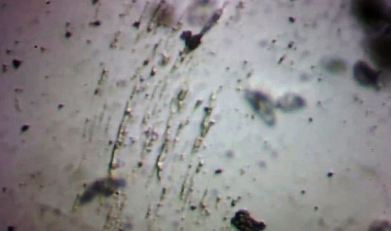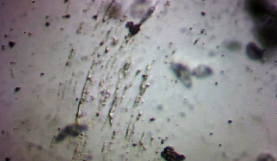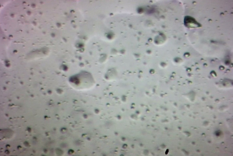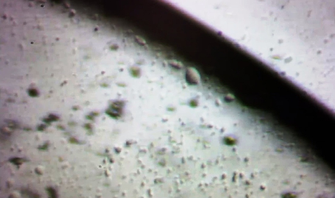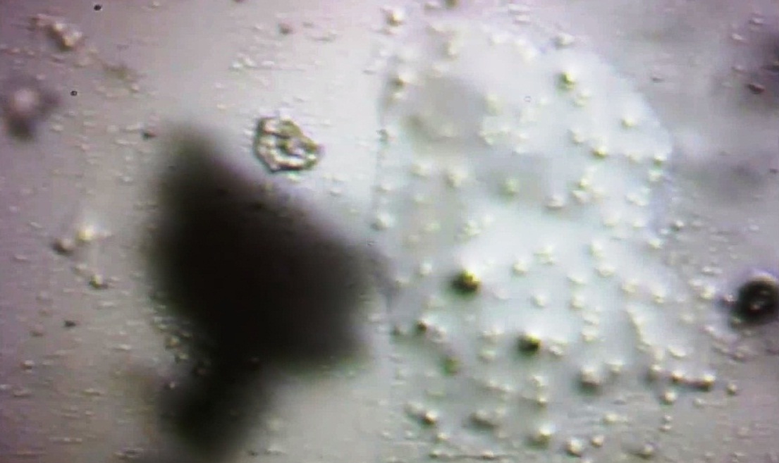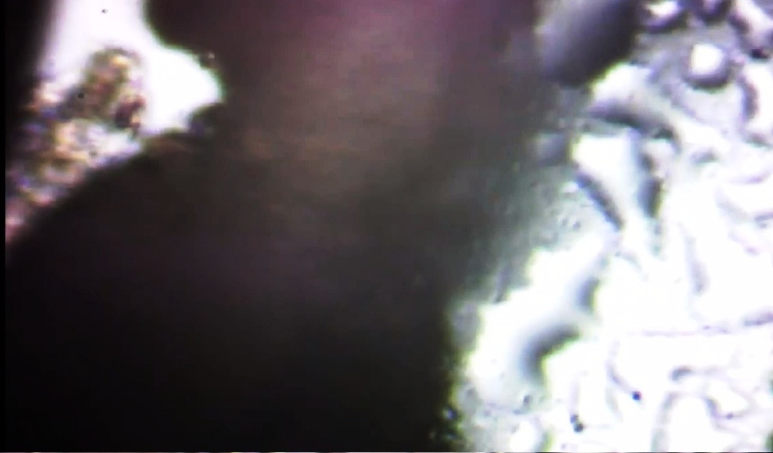 En un inicio, almacené el chicle en un frasco gotero que se puede sellar para evitar la contaminación externa. Se escogió un pedazo al que le hice un corte transversal para ser visualizado a 10x y 40x. El 24 de febrero pude determinar que 10x era la magnificación idónea para grabar. Se hizo una grabación breve de prueba, en la que se encontró una similitud de las bacterias con la Luna y la Tierra. Este video borrador se presentó en el taller el 9 de marzo para retroalimentación del grupo. El 26 de marzo hice una grabación de casi una hora y media, la cual revela que el chicle es una imagen microscópica del universo. Esta grabación se editó para tener un videopoema de poco más de dos minutos de duración. El sonido de fondo es una experimentación con sonidos relacionados con la respiración humana.